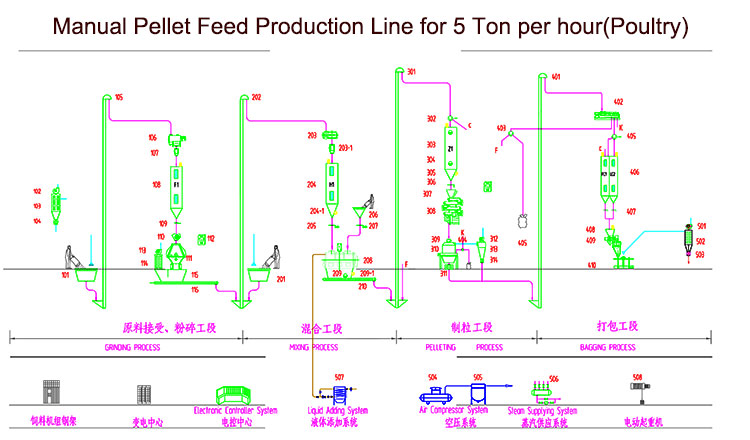 Grinder - Mixer - Lifting machine - Storage silo - Feed conditioning machine - pelletizer - Lifting machine - Dryers and coolers - bag fillers